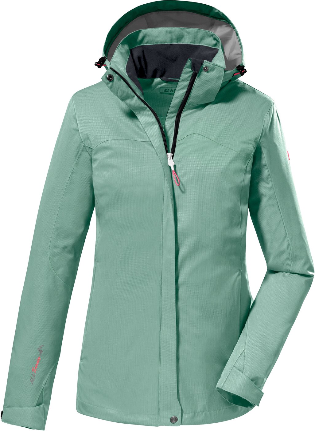 Die Damen Funktionsjacke von killtec schützt zuverlässig bei Wind und Wetter. Sie ist durch verschweißte Nähte und mit einer 10.000 mm Wassersäule zu 100% wasser- und winddicht. Die abzippbare Kapuze sowie der Saum lassen sich individuell verstellen. Die Ärmelbündchen lassen sich anhand von Klettverschlüssen regulieren. Der verdeckte Frontreißverschluss ist mit einem Kinnschutz versehen, der das Einklemmen der Haut verhindert. Zwei Seitentaschen und eine Innentasche bietet genügend Stauraum. killtec liegt es besonders am Herzen, die Kollektionen nachhaltiger und zukunftsfähiger zu machen. So setzt killtec verstärkt auf verantwortungsbewusstere Herstellungsverfahren. Diese Jacke ist daher PFC-frei.