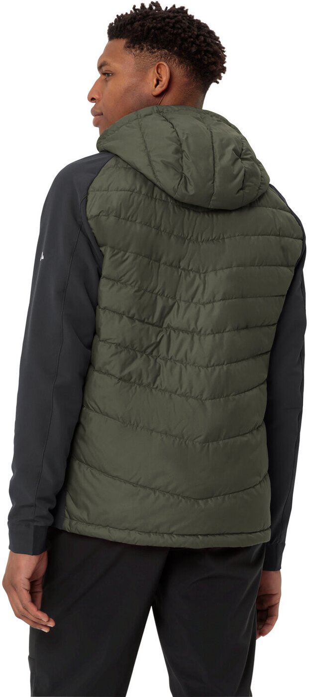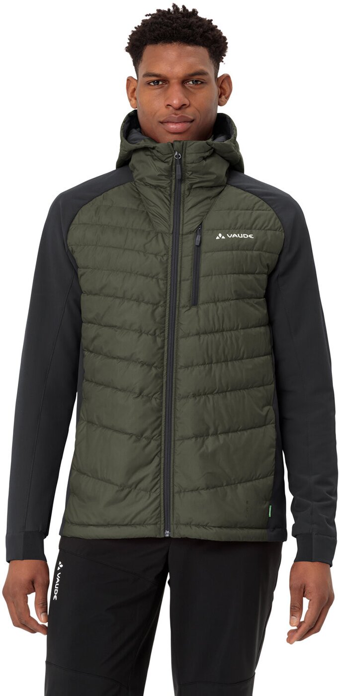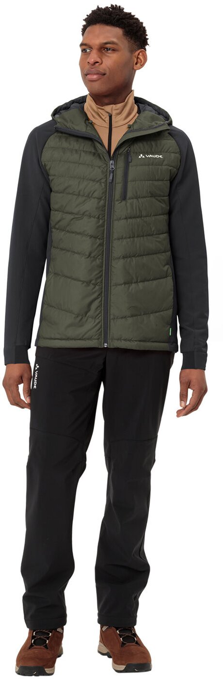 Prima Klima – die umweltfreundliche, sportive Hybrid Herrenjacke Elope bietet mit ihrem Materialmix aus elastischem, dampfdurchlässigen Stormfleece an den Ärmeln und der warmen, daunenähnlien Synthetikfüllung am Rumpf die ideale Kombination aus Wärmeschutz und Atmungsaktivität. Das komfortable, funktionelle Hybridmaterial sorgt nicht nur für ein ausgeglichenes Körperklima auf anspruchsvollen Winterwanderungen, es sieht zudem auch noch richtig gut aus. Die Herren Kapuzenjacke hat zwei Reißverschluss-Eingrifftaschen, eine Reißverschlusstasche an der Brust, elastische Ärmelbündchen und eine praktische Kapuzenverstellung. Die Men’s Elope Hybrid Jacke wurde klimafreundlich aus recyceltem Material hergestellt. Ein toller Midlayer, der in der Übergangszeit solo oder im Winter unter einer Hardshell getragen kann. Das VAUDE Green Shape-Label steht für ein umweltfreundliches, funktionelles Produkt aus nachhaltigen, bluesign® zertifizierten Materialien.