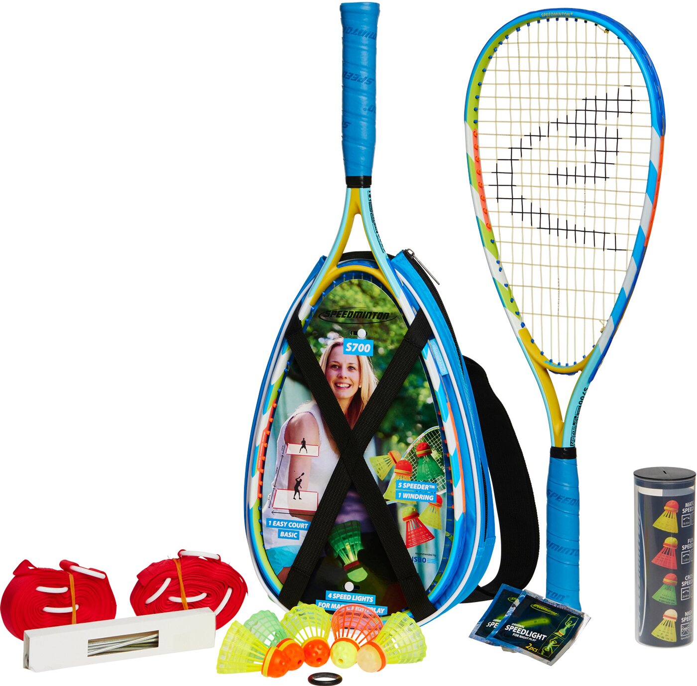 Das Speedminton® Set S700 ist ein optimales Allround-Set mit transportablem Spielfeld. Spielen Sie ohne Netz und ohne Limits ? anywhere, anytime! In einer Mix Tube sind fünf Speeder® (Bälle für Crossminton) enthalten (1 FUN, 2 MATCH, 1 CROSS, 1 NIGHT): Perfekt für Einsteiger: der FUN Speeder®. Schon beim ersten Spielen sorgt er für schnelle Erfolge und ungetrübten Spielspaß. Eingespielt? Dann nutzen Sie den MATCH Speeder®. Der offizielle Wettkampfball wird von Profis gespielt und sorgt für schnelle Ballwechsel. Speziell für Outdoor-Spiele wurde der CROSS Speeder® entwickelt. Für lange Distanzen auch bei Wind. Speeden bis die Sonne untergeht ? und noch länger: der NIGHT Speeder® mit Speedlight (Knicklicht) ermöglicht das Spielen bis in die Nacht. Die Speeder® von Speedminton® werden entwickelt und hergestellt in Deutschland. Es finden Regelmäßige Qualitätskontrollen aller Produkte statt.