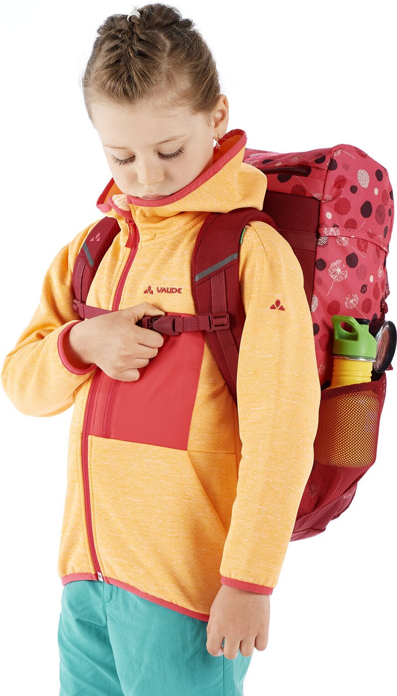Der Skovi 15 Kinderrucksack bringt Praxisnähe auf den Punkt! In seinem Hauptfach haben alle Dinge Platz, die der Nachwuchs unterwegs schnell zur Hand haben möchte – sei es die Brotzeitdose, das Kuscheltier oder Wechselbekleidung. Dazu kommen zwei Netzaußentaschen, die Platz für Accessoires bieten, egal ob es nun die Mütze ist oder eine kleine Trinkflasche. VAUDE hat auch an die Details gedacht – so verfügt er über eine praktische Reißverschlusstasche an der Deckelklappe und reflektierende Elemente. Damit der Entdeckungsdrang auch ausreichend gestillt wird, hat Vaude dem Skovi 15 Kinderrucksack eine Lupe beigelegt. Ein prima Begleiter für Kindergarten und Alltag, aber auch für die ersten Wander- und Bergtouren. Dieser Rucksack besteht anteilig aus Recycling-Material und ist mit Eco Finish umweltfreundlich wasserabweisend ohne Fluorcarbone (PFC) hergestellt. Das VAUDE Green Shape-Label steht für ein umweltfreundliches, funktionelles Produkt aus nachhaltigen, bluesign®-zertifizierten Materialien.